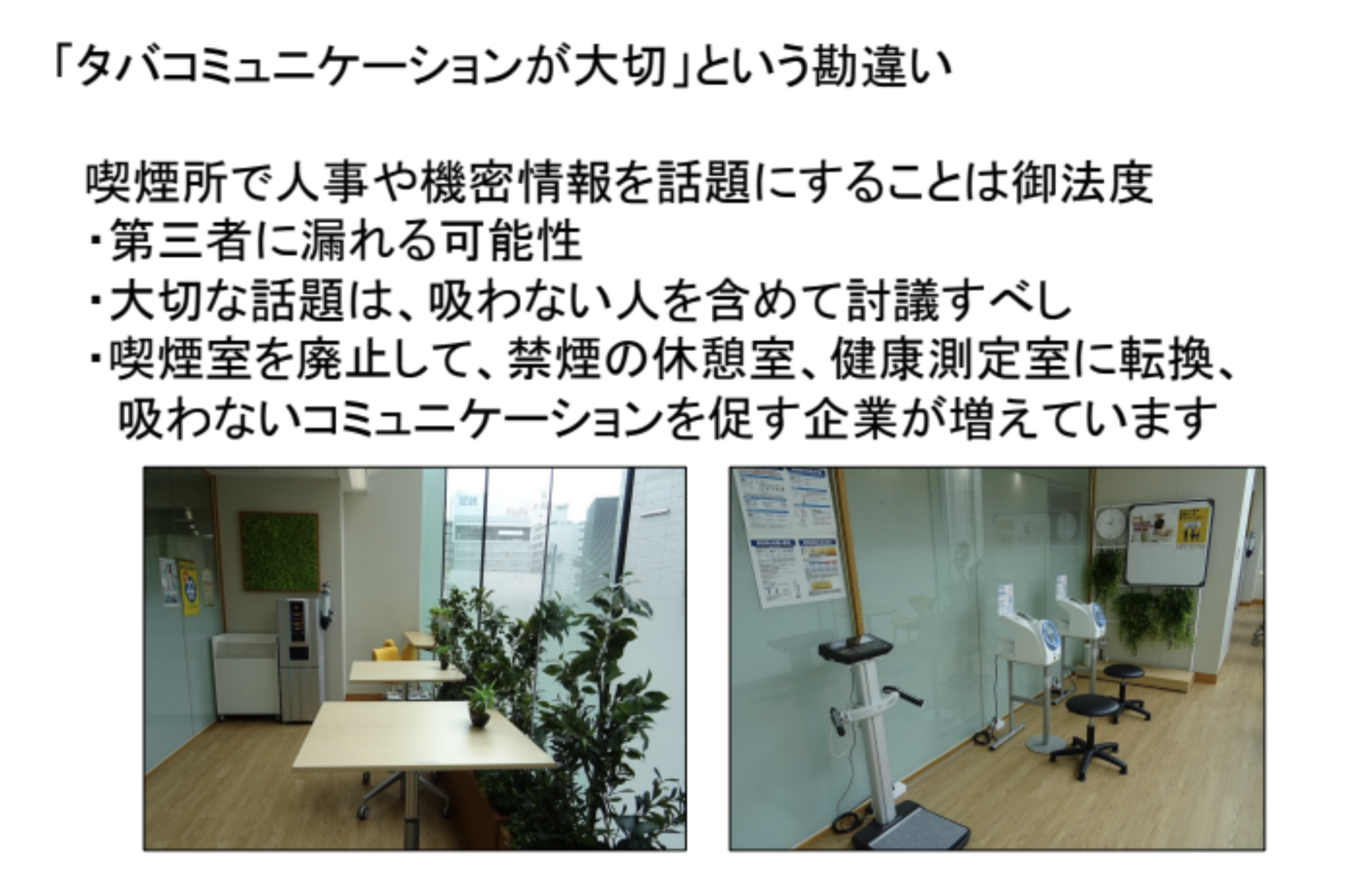- 喫煙室という非喫煙者が入れない場所での会話ではなく、お茶を飲みながら全員が会話できる場所と時間を確保することが重要です。