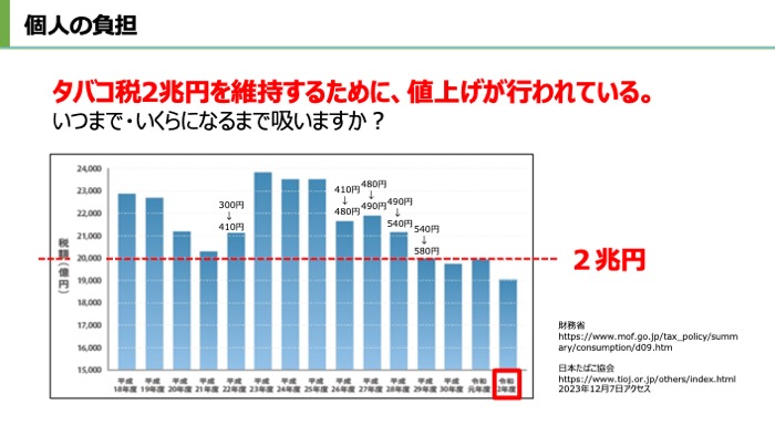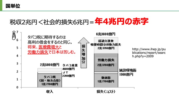 タバコ税は年間2兆円、タバコ関連損失は同6兆円。