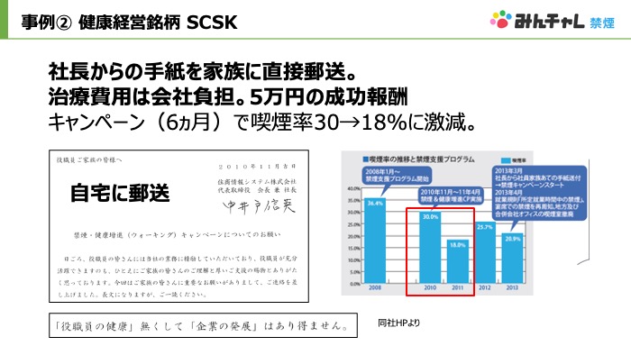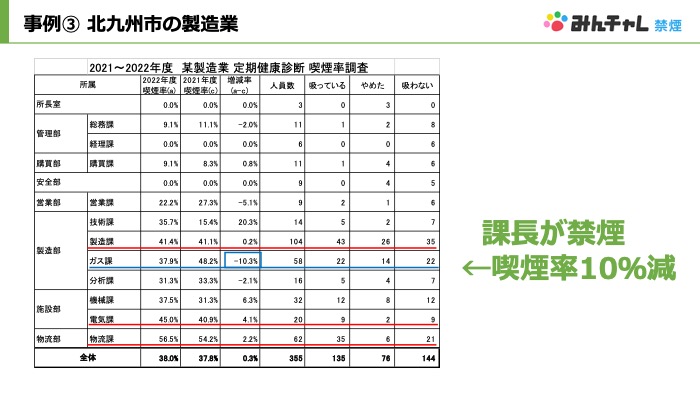 逆に、上司が禁煙すると部下は無言のプレッシャーを感じ、禁煙率が上昇します。トップや経営層ほど、喫煙しない、飲み過ぎない、運動して、良好なライフスタイルのお手本となるべきです。 - 仮にトップが禁煙する気持ちがない場合であっても、社長は結構ですから社員の禁煙率100%を目指す活動は実施します、とすれば、恥ずかしくて禁煙することが期待できます。
