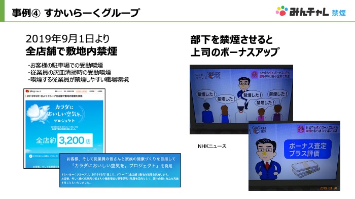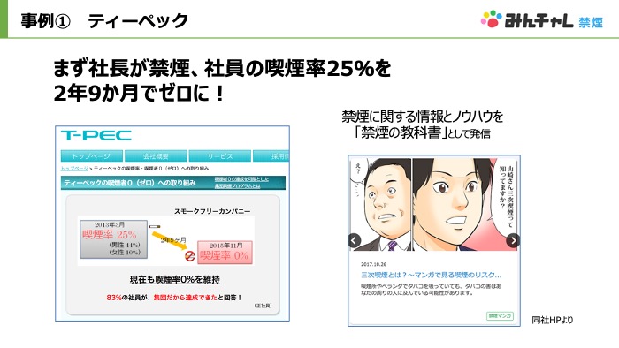 小学生のころから喫煙防止教育を受けてきた若者には、職場がタバコ臭くないことはアピールポイントです。 逆に、タバコに甘い企業は敬遠される時代になりました。 2015年に敷地内禁煙を実施したリコーでは、高専出身の若者が多数応募、ジヤトコでは季節工の応募に全く影響がなかったことが示されています。 関連する禁煙応援動画 ・禁煙応援動画_敷地内禁煙の進め方